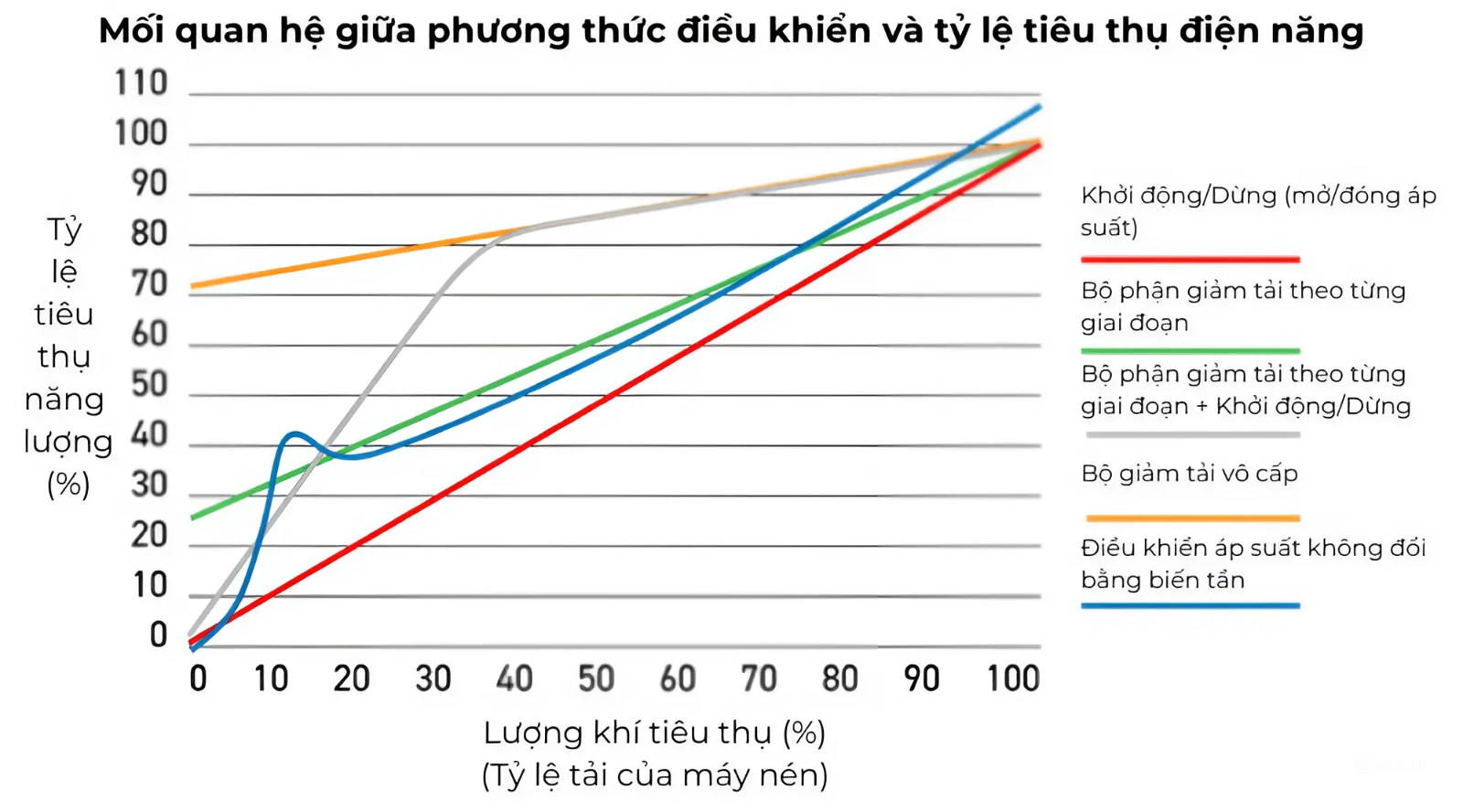 Mặc dù mức độ sử dụng khí nén (tải của máy nén) là giống nhau, nhưng hiệu suất tiêu thụ điện năng có thể thay đổi tùy thuộc vào phương thức điều khiển được áp dụng.