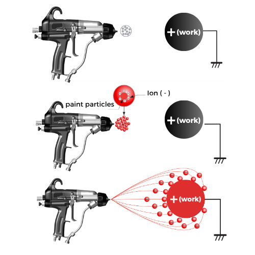 Sử dụng công nghệ phun phủ tĩnh điện, một trường điện được tạo ra giữa phôi đất (cực dương) và thiết bị phun được nạp điện áp âm cao (cực âm). Các hạt sơn được phân mịn, mang điện tích âm, được hút về phía phôi và bám chặt vào bề mặt của nó.Phương pháp sáng tạo này giảm đáng kể hiện tượng phun thừa, giảm lượng sơn sử dụng (giảm chi phí), rút ngắn thời gian sơn (nâng cao hiệu quả công việc) và cải thiện điều kiện làm việc đồng thời bảo vệ môi trường—mang lại một giải pháp cách mạng cho nhu cầu phủ bề mặt hiện đại.