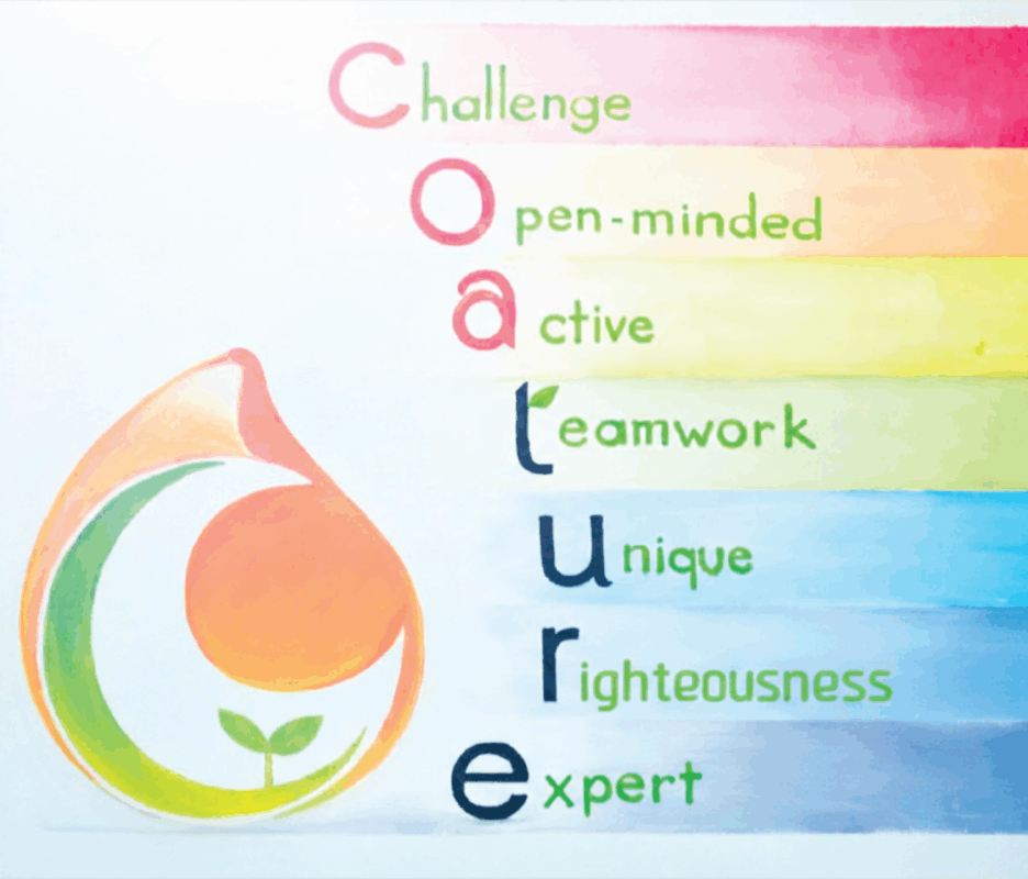 Challenge / Open-minded / Active / Teamwork/ Unique / Righteousness / Expert