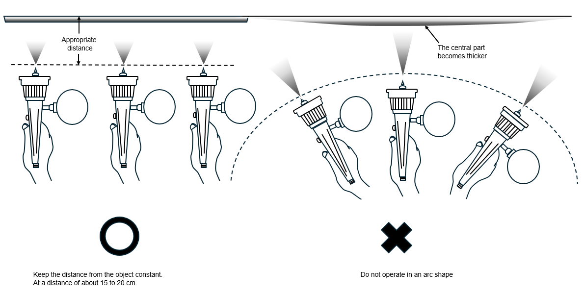 - Order of Spraying: Start from the outside of the surface and switch to the second stage of spraying at the edge. After passing the endpoint, switch back to the first stage.