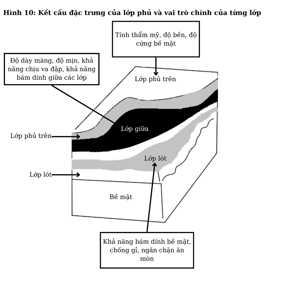 Quá trình sơn phủ cơ bản bao gồm việc sơn một lớp màng sơn hoàn chỉnh gồm ba lớp cấu thành: lớp sơn lót, lớp sơn giữa và lớp phủ ngoài. Độ dày của màng sơn (cộng nhiều lớp) tối đa là 0.1mm (100µm, tương đương độ dày khoảng hai tờ giấy báo), và thậm chí độ dày của lớp sơn phủ giàu kẽm với chức năng chống ăn mòn cao cũng chỉ gấp khoảng ba lần độ dày đó (khoảng 250 µm theo thông số kỹ thuật của lớp phủ theo điều kiện môi trường C-5). Điều này là do rất khó đạt được các mục đích sử dụng khác nhau với chỉ một lớp sơn, nên hiệu quả được đảm bảo thông qua việc kết hợp của nhiều lớp sơn. Trong sơn lacquer truyền thống, sau khi xử lý bề mặt, ba lớp—sơn lót, lớp sơn giữa và lớp phủ ngoài—sẽ được sơn lên. Các lớp sơn này hoạt động cùng nhau có vai trò như một nhóm sơn phủ và phục vụ nhiều chức năng khác nhau. Vai trò khái quát của mỗi lớp trong sơn được minh họa trong Hình 10.