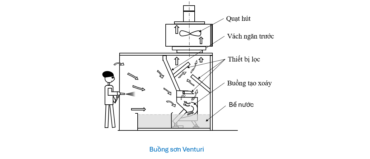 Buồng Venturi: Sức hút của quạt hút nâng mực nước lên, sau đó giúp nước tiếp xúc bụi sơn và gom chúng lại trong buồng ly tâm. Mực nước trong bể ảnh hưởng đáng kể đến hiệu suất thu gom, do đó việc quản lý mực nước trở nên cực kỳ quan trọng. Loại buồng này mặc dù cung cấp hiệu suất thu gom cao, nhưng nó có nhược điểm là tiêu thụ năng lượng đáng kể và gây tiếng ồn.